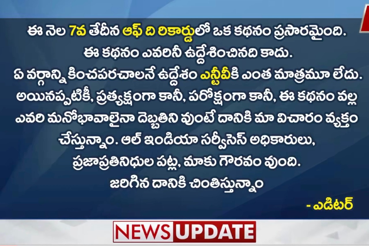 తెలంగాణలో ఓ మంత్రి, ఓ మహిళా ఐఏఎస్ అధికారికి సంబంధించి ప్రసారం చేసిన వివాదాస్పద కథనంపై ప్రముఖ తెలుగు న్యూస్ ఛానెల్ ఎన్టీవీ (NTV) బహిరంగంగా క్షమాపణ చెప్పింది. ఈ కథనం ఓ మహిళా ఐఏఎస్ అధికారిణి ప్రతిష్టకు భంగం కలిగించేలా ఉందని ఐఏఎస్ అధికారుల సంఘం ఆరోపించడంతో పాటు, పోలీసులకు ఫిర్యాదు చేసింది. ఈ పరిణామాల నేపథ్యంలో ఎన్టీవీ యాజమాన్యం, తమ ప్రసారం వల్ల ఎవరి మనోభావాలు దెబ్బతిన్నా విచారం వ్యక్తం చేస్తున్నట్లు ప్రకటించింది.