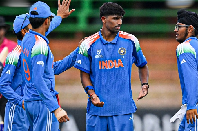 అనంతరం బ్యాటింగ్ ప్రారంభించిన భారత్కు ఆదిలోనే ఎదురుదెబ్బ తగిలింది. ఈ మ్యాచ్ ద్వారా 14 ఏళ్ల 294 రోజులకే అరంగేట్రం చేసి, U19 ప్రపంచకప్లో ఆడిన అత్యంత పిన్న వయస్కుడిగా ప్రపంచ రికార్డు సృష్టించిన వైభవ్ సూర్యవంశీ త్వరగా ఔటయ్యాడు. కాసేపటికే వర్షం, మెరుపుల కారణంగా ఆటకు అంతరాయం కలిగింది. దీంతో భారత లక్ష్యాన్ని 37 ఓవర్లలో 96 పరుగులుగా నిర్ధారించారు. వర్షం తర్వాత ఆట మొదలవగా, భారత్ 25 పరుగులకే 3 వికెట్లు కోల్పోయి కష్టాల్లో పడింది. ఈ దశలో అభిగ్యాన్ కుందు (42 నాటౌట్), విహాన్ మల్హోత్రా కీలక భాగస్వామ్యం నెలకొల్పి జట్టును విజయ తీరాలకు చేర్చారు.
