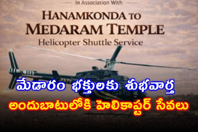 తెలంగాణ కుంభమేళాగా ప్రసిద్ధిగాంచిన మేడారం సమ్మక్క-సారలమ్మ మహాజాతరకు వెళ్లే భక్తులకు రాష్ట్ర ప్రభుత్వం శుభవార్త చెప్పింది. జాతర సమయంలో వేగంగా గమ్యస్థానం చేరుకునేందుకు వీలుగా హెలికాప్టర్ సేవలను అందుబాటులోకి తెచ్చింది. తెలంగాణ పర్యాటక శాఖ, తుంబి ఎయిర్‌లైన్స్ సంయుక్తంగా అందిస్తున్న ఈ సేవలు ఇవాళ్టి నుంచి ప్రారంభమయ్యాయి.