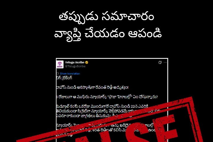 ముఖ్యమంత్రి రేవంత్ రెడ్డి అధికారిక విదేశీ పర్యటనలో ఎలాంటి సమాచారం లేకుండా వ్యక్తిగత పర్యటనపై వెళ్లారని సామాజిక మాధ్యమాల్లో జరుగుతున్న ప్రచారంపై తెలంగాణ ఫ్యాక్ట్ చెక్ విభాగం స్పందించింది. 'తెలంగాణ ముఖ్యమంత్రి విదేశీ పర్యటనపై తప్పుడు ప్రచారం' అంటూ 'ఎక్స్' వేదికగా వివరణ ఇచ్చింది. ఆరోపణలు పూర్తిగా నిరాధారమైనవని, దురుద్దేశపూర్వకంగా చేసిన ప్రచారమే అని తెలిపింది.
