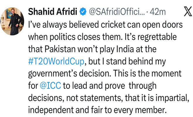 షెడ్యూల్ ప్రకారం ఈ నెల 15న కొలంబో వేదికగా భారత్, పాకిస్థాన్ మధ్య మ్యాచ్ జరగాల్సి ఉంది. అయితే, ఐసీసీపై నిరసనగా ఈ మ్యాచ్ ఆడవద్దని పాక్ ప్రభుత్వం తమ జట్టును ఆదేశించింది. దీనిపై అఫ్రిదీ స్పందిస్తూ.. "రాజకీయాలు మూసేసిన తలుపులను... క్రికెట్ తెరుస్తుందని నేను నమ్ముతాను. టీ20 వరల్డ్ కప్లో పాకిస్థాన్ భారత్తో ఆడకపోవడం విచారకరం. కానీ, మా ప్రభుత్వ నిర్ణయానికి కట్టుబడి ఉంటాను. ఐసీసీ తన నిష్పాక్షికతను మాటలతో కాకుండా చేతలతో నిరూపించుకోవాల్సిన సమయం ఇది" అని సోషల్ మీడియా ప్లాట్ఫామ్ 'ఎక్స్'లో పోస్ట్ చేశాడు.