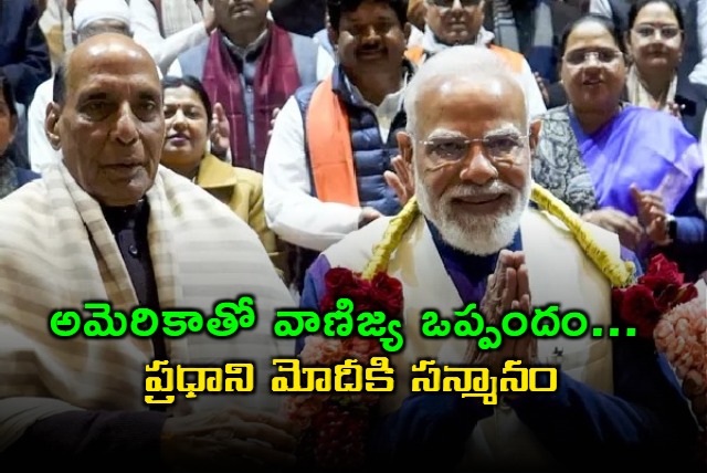 భారత్‌తో ట్రేడ్ డీల్‌కు అమెరికా అధ్యక్షుడు డొనాల్డ్ ట్రంప్ ఓకే చెప్పిన నేపథ్యంలో ప్రధానమంత్రి నరేంద్ర మోదీకి ఎన్డీయే ఎంపీలు సన్మానం చేశారు. ఈ ఒప్పందం కోసం మోదీ చేసిన కృషికి గాను వారు సన్మానం చేశారు. ఈ సన్మానం సమయంలో ఎంపీలు 'భారత్ మాతాకీ జై', 'వందేమాతరం' అంటూ నినాదాలు చేశారు.