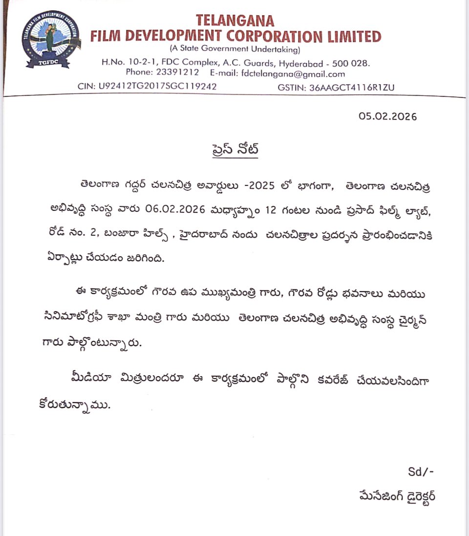 ప్రజా గాయకుడు, విప్లవకారుడు గద్దర్ స్మారకార్థం తెలంగాణ ప్రభుత్వం ప్రతిష్ఠాత్మకంగా 'తెలంగాణ గద్దర్ ఫిల్మ్ అవార్డ్స్'ను ఏర్పాటు చేయడం తెలిసిందే. తెలంగాణ ఫిల్మ్ డెవలప్‌మెంట్ కార్పొరేషన్ (టీఎఫ్‌డీసీ) ఆధ్వర్యంలో జరగనున్న ఈ అవార్డుల ప్రక్రియలో భాగంగా చిత్రాల ప్రదర్శన కార్యక్రమం రేపు (ఫిబ్రవరి 6) ప్రారంభం కానుంది.