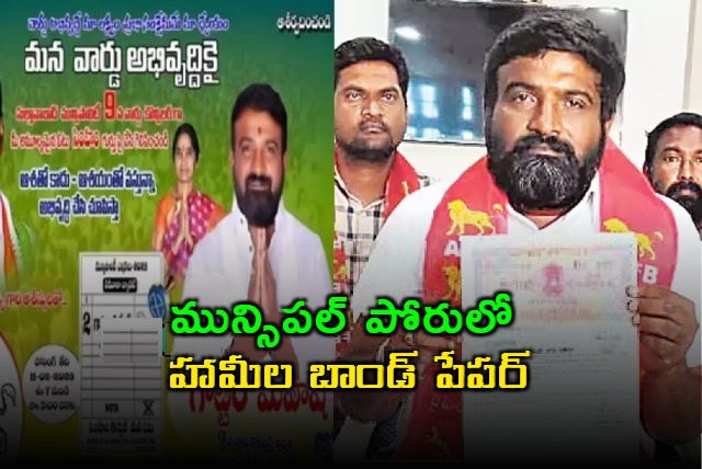 సుల్తానాబాద్ మున్సిపాలిటీ 9వ వార్డు నుంచి ఆల్ ఇండియా ఫ్వార్వార్డ్ బ్లాక్ పార్టీ తరఫున గొట్టం మహేశ్ పోటీ చేస్తున్నారు. తనను గెలిపిస్తే చేపట్టబోయే పనులు, వార్డు ప్రజల సంక్షేమం కోసం అమలు చేయబోయే పథకాలను మహేశ్ ఓ బాండ్ పేపర్ పై రాసి మరీ విడుదల చేశారు. వార్డులో పెళ్లి చేసుకునే యువతులకు రూ.25,016 కానుక, ఆడపిల్ల పుడితే రూ.10,016, మగ పిల్లాడు పుడితే రూ.5,016 అందిస్తానని చెప్పారు. ఈ హామీలను అమలు చేయలేకపోతే కౌన్సిలర్ పదవికి రాజీనామా చేస్తానని బాండ్ పేపర్ లో పేర్కొన్నారు.