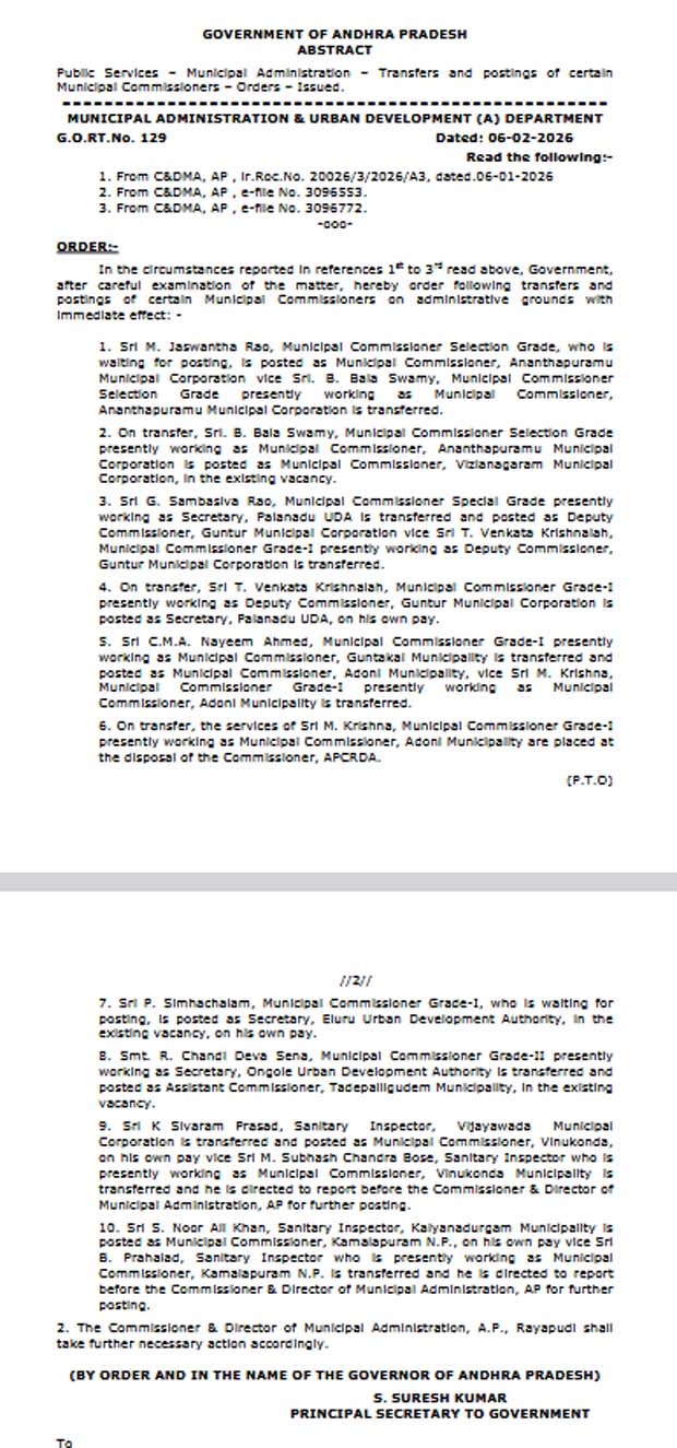 అనంతపురం మున్సిపల్ కమిషనర్గా ఎం జస్వంత్రావును నియమించగా.. అక్కడ పనిచేస్తున్న బి బాలస్వామిని విజయనగరానికి బదిలీ చేశారు. పల్నాడు యూడీఏ కార్యదర్శిగా ఉన్న జి సాంబశివరావును గుంటూరు మున్సిపల్ కార్పొరేషన్లో డిప్యూటీ కమిషనర్గా నియమించారు. గుంటూరులో ఉన్న టి వెంకటకృష్ణయ్యను పల్నాడు యూడీఏ సెక్రటరీగా నియమించారు.