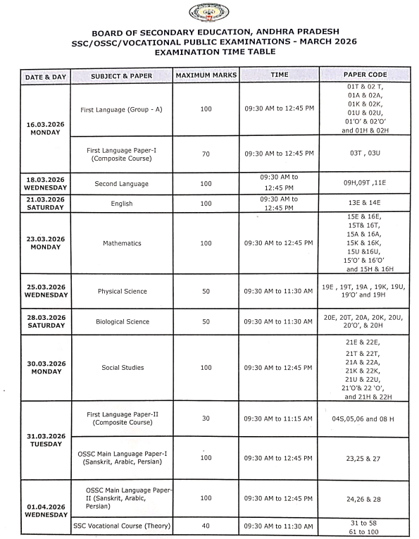 కాగా, పదో తరగతి పరీక్షలు ముందుగా నిర్ణయించినట్లుగానే మార్చి 16 నుంచి ఏప్రిల్ 1 వరకు జరగనున్నాయి. ప్రతీరోజూ ఉదయం 9:30 గంటల నుంచి మధ్యాహ్నం 12:45 గంటల వరకు పరీక్షలు నిర్వహిస్తారు. సవరించిన పూర్తి టైమ్ టేబుల్ కోసం విద్యార్థులు అధికారిక వెబ్సైట్ bse.ap.gov.inను సందర్శించాలని విద్యాశాఖ అధికారులు సూచించారు.
