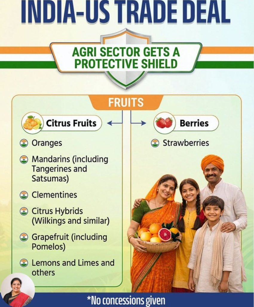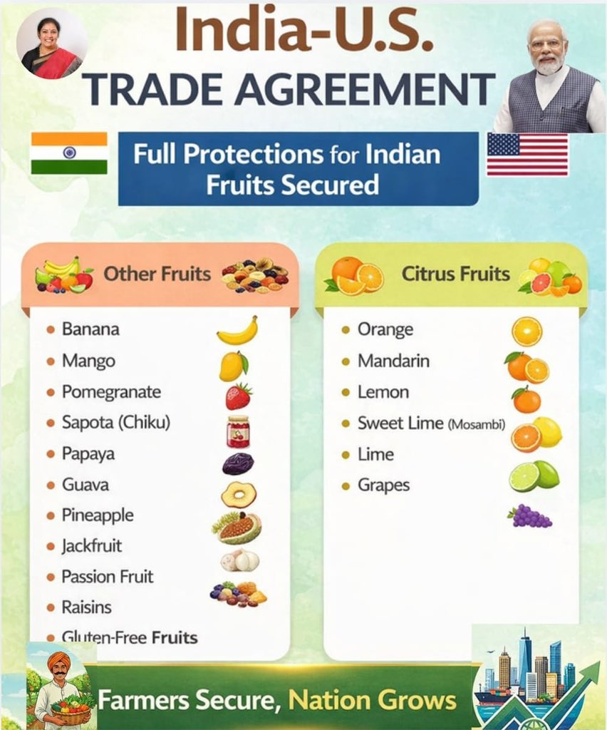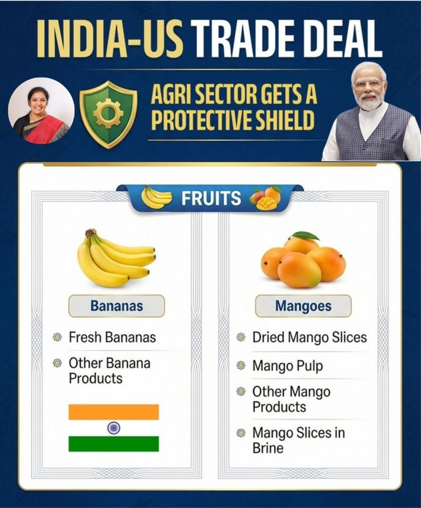 "భారత్, అమెరికా మధ్య కుదిరిన కీలక వాణిజ్య ఒప్పందం దేశీయ వ్యవసాయ రంగానికి పూర్తిస్థాయిలో రక్షణ కల్పిస్తోంది. ఎగుమతులకు కొత్త ఊపునిస్తూనే, దేశీయ రైతుల ప్రయోజనాలను కాపాడేలా సమతుల్య విధానంతో ఈ ఒప్పందాన్ని రూపొందించారు. ఒప్పందం ప్రకారం, సున్నితమైన వ్యవసాయ ఉత్పత్తులపై భారత్ ఎలాంటి సుంకాల రాయితీలు కానీ, మార్కెట్ యాక్సెస్ కానీ ఇవ్వలేదు. ముఖ్యంగా అరటి, మామిడి, సిట్రస్ పండ్లు, బెర్రీలు వంటి ఉద్యాన పంటలకు సంపూర్ణ రక్షణ కల్పించారు. దీంతో దిగుమతుల ఒత్తిడి లేకుండా రైతుల ఆదాయానికి భద్రత చేకూరనుంది.