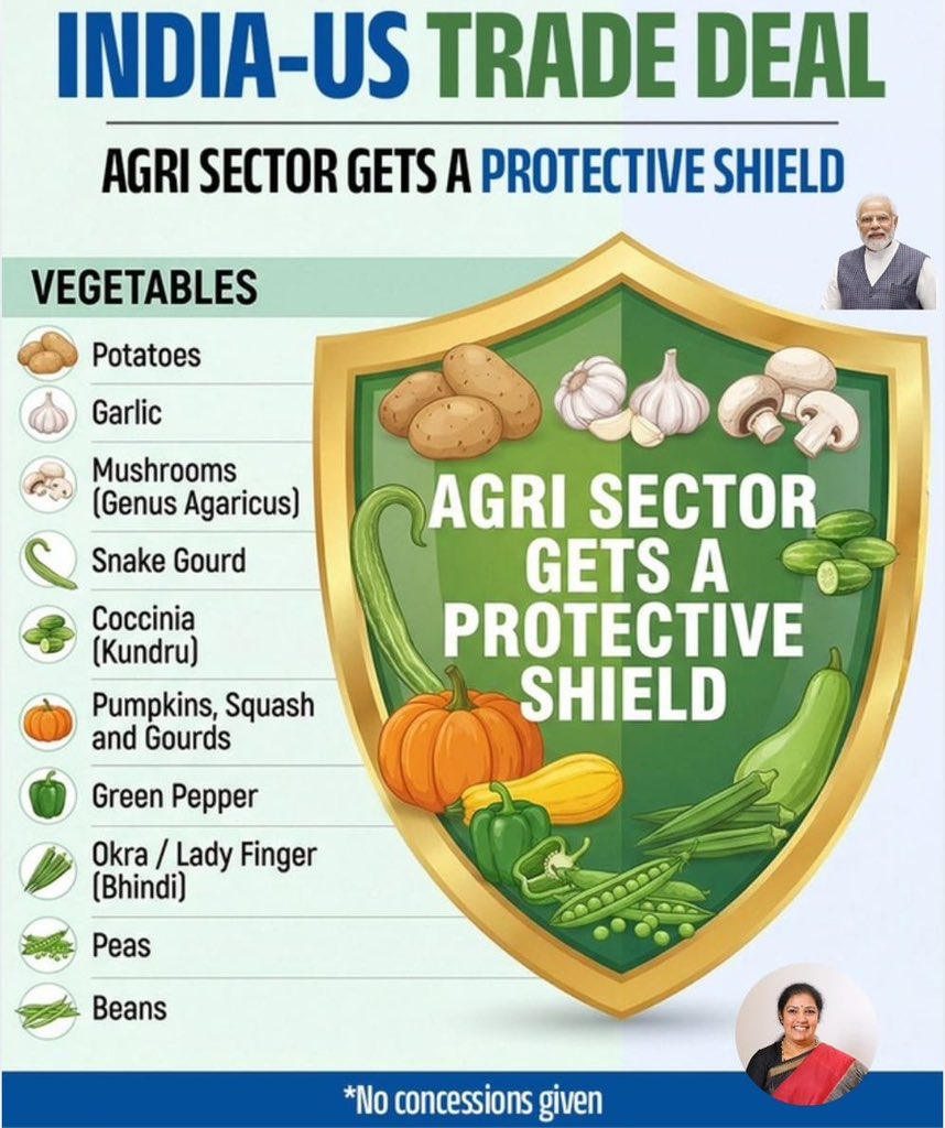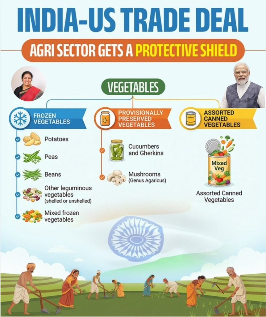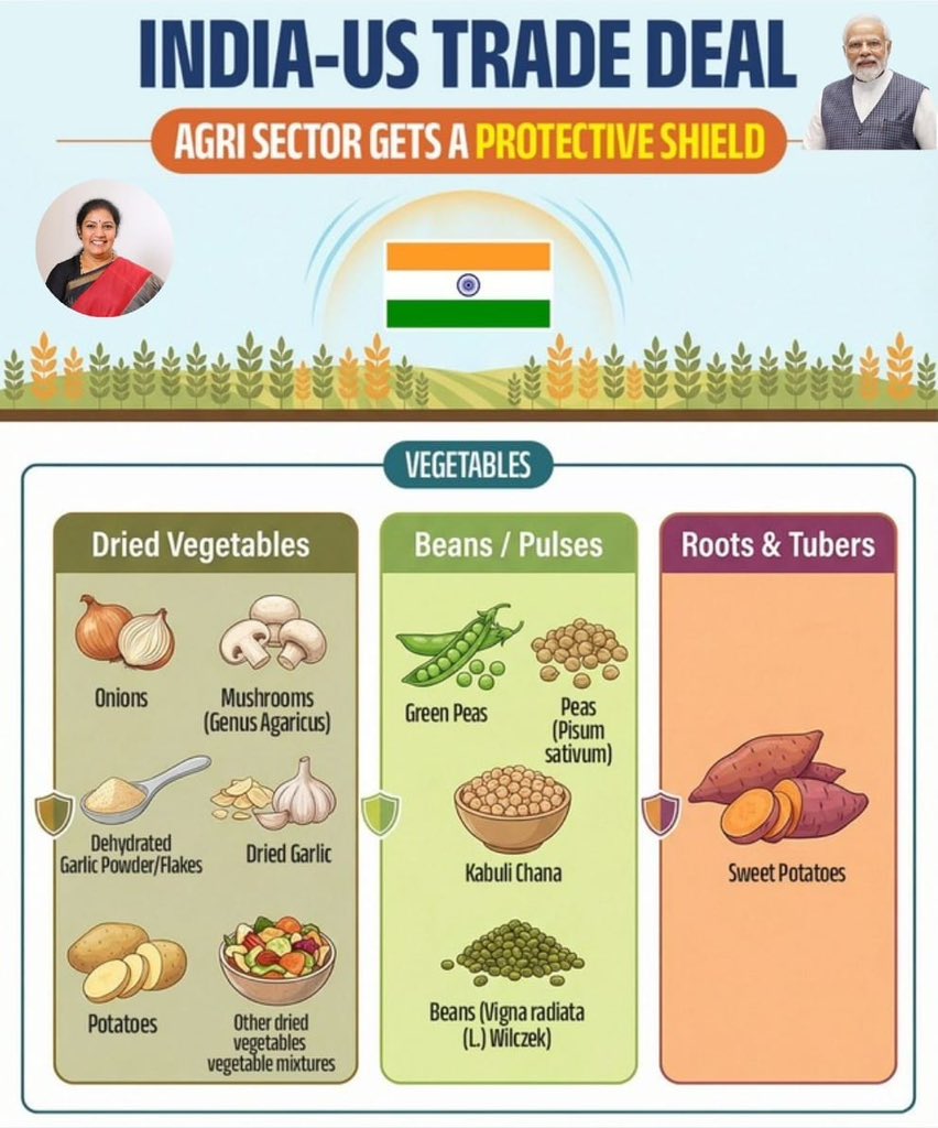 ఉల్లిపాయలు, మష్రూమ్స్, వెల్లుల్లి, బంగాళాదుంప, బఠాణీ, శనగలు, బీన్స్ వంటి ప్రధాన కూరగాయలన్నీ రక్షణ పరిధిలోనే ఉన్నాయి. విదేశీ పోటీ నుంచి దేశీయ రైతులకు భరోసా కల్పిస్తూ, ధరల స్థిరత్వాన్ని కాపాడటమే లక్ష్యంగా ఈ నిర్ణయాలు తీసుకున్నారు. ఆహార భద్రత, గ్రామీణ జీవనోపాధికి భంగం కలగకుండానే వాణిజ్యాన్ని వృద్ధి చేసే దిశగా ఈ ఒప్పందం దోహదపడనుంది" అని వివరించారు.
