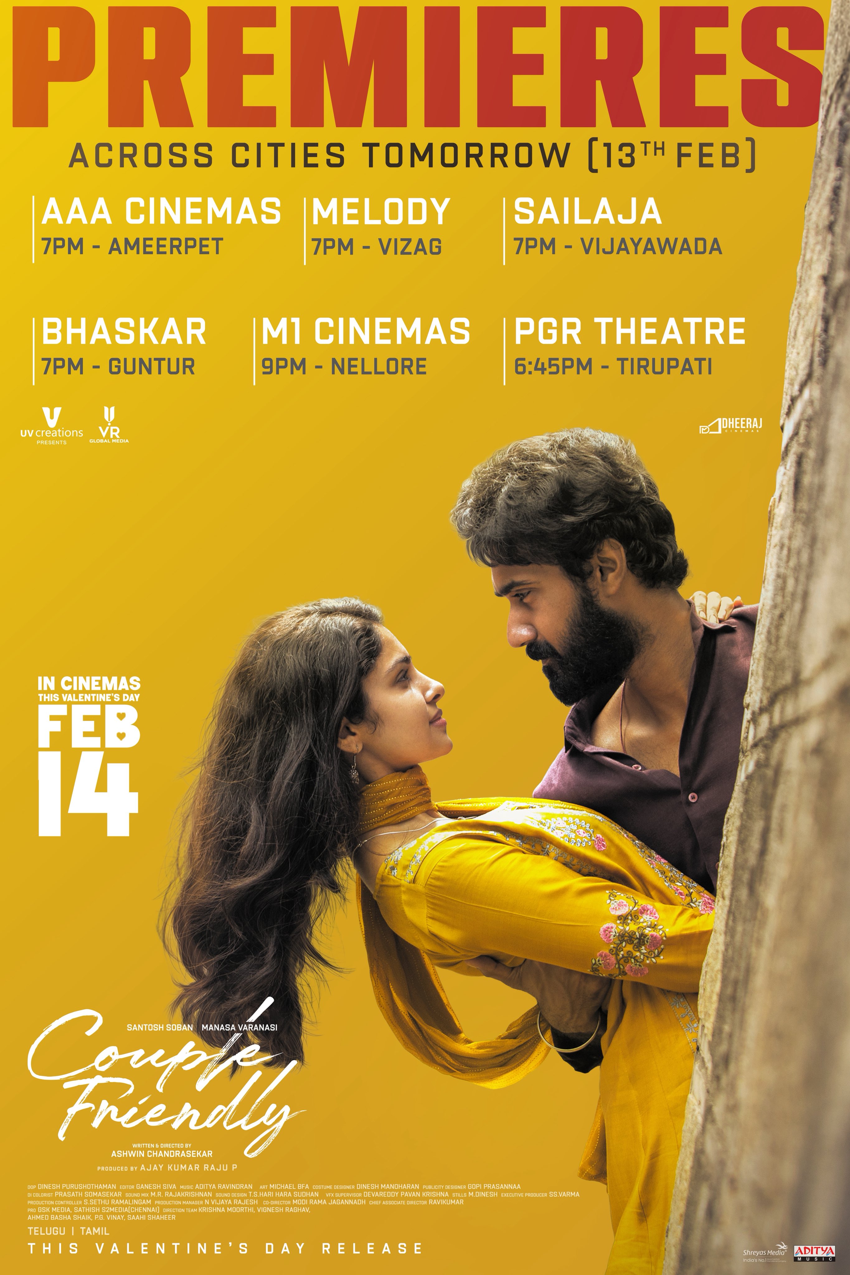 యంగ్ హీరో సంతోష్ శోభన్, మాజీ మిస్ ఇండియా మానస వారణాసి జంటగా నటించిన రొమాంటిక్ ఎంటర్టైనర్ 'కపుల్ ఫ్రెండ్లీ'. ఈ చిత్రం ప్రేమికుల దినోత్సవం సందర్భంగా ఫిబ్రవరి 14న థియేటర్లలో విడుదల కానుంది. అయితే, విడుదలకు ఒక రోజు ముందే, అంటే ఫిబ్రవరి 13న, తెలుగు రాష్ట్రాల్లోని పలు ప్రధాన నగరాల్లో ప్రత్యేక ప్రీమియర్ షోలను ఏర్పాటు చేశారు.