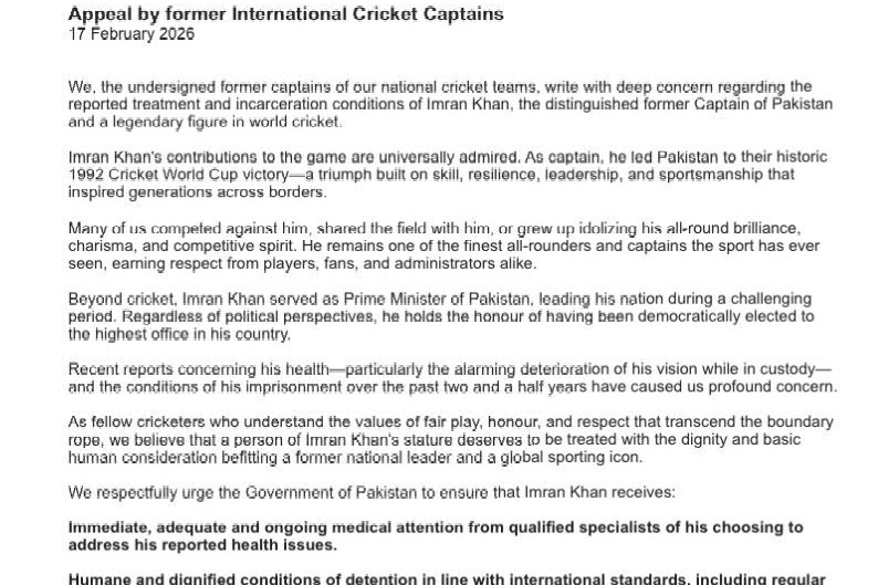 Tue 14:47 ఇమ్రాన్ ఖాన్ కోసం పాకిస్థాన్ ప్రధానికి ప్రపంచ మాజీ కెప్టెన్ల లేఖ.. కపిల్ దేవ్, గవాస్కర్ కూడా! రావల్పిండి జైల్లో అనారోగ్యంతో ఉన్న ఇమ్రాన్ ఖాన్ పాకిస్థాన్ ప్రభుత్వం, ప్రధానికి మాజీ క్రికెటర్ల పిటిషన్ ఇమ్రాన్ ఖాన్కు వైద్య సహాయం అందించాలని మాజీల విజ్ఞప్తి సంతకాలు చేసిన 14 మందిలో కపిల్ దేవ్, సునీల్ గవాస్కర్ Read full story