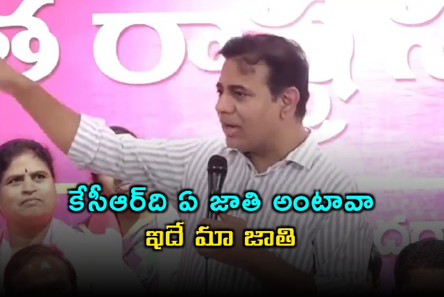 "కొందరు అడుగుతున్నారు నీది ఏ జాతి అని. ఏ జాతికి జాతి పిత అని అడుగుతున్నారు. వారికి నేను సమాధానం చెబుతున్నాను. ఏ జాతి అనే అల్పుడికి నేను చెబుతున్నాను. రాజ్యతంత్రం నడిపిన రుద్రమ జాతి మాది. జల్ జంగల్ జమీన్ అని కొట్లాడిన కొమురంభీం, అస్తిత్వం కోసం అమరులైన సమ్మక్క, సారక్క, కోటల మీద జెండా ఎగురవేసిన బహుజన వీరుడు సర్దార్ సర్వాయిపాపన్న, భూస్వాముల దోపిడి మీద కొట్లాడిన దొడ్డి కొమురయ్య, బరిలో బందూకు పట్టి దేశ్ముఖ్లను తరిమికొట్టిన వీరనారి చాకలి ఐలమ్మ, సామాజిక విప్లవకారుడు భాగ్యరెడ్డి వర్మ, సిపాయిల తిరుగుబాటు బావుటా ఎగురవేసిన తుర్రెబాజ్ ఖాన్, ప్రాంతం వాడు మోసం చేస్తే ప్రాంతంలోనే ఉప్పుపాతర వేస్తామన్న కాళేజీ, నా తెలంగాణ కోటి రతనాల అన్న దాశరథి, విద్యార్థి అమరవీరుల జాతి మాది" అని కేటీఆర్ ఉద్ఘాటించారు.