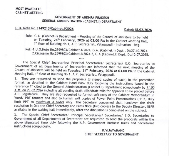 - సీఎం చంద్రబాబు అధ్యక్షతన 24వ తేదీ మధ్యాహ్నం 3 గంటలకు కేబినెట్ భేటీ