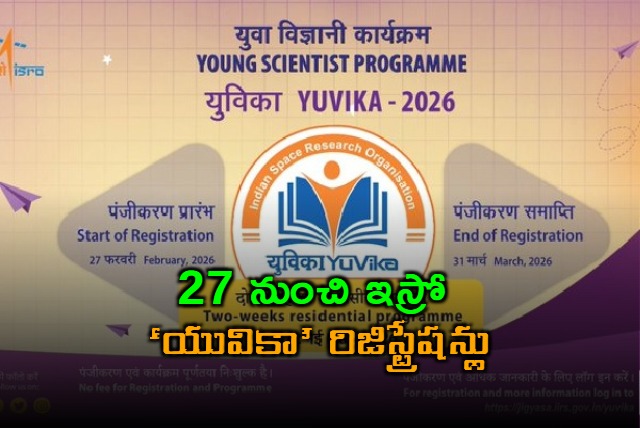 ఇస్రో ఏటా నిర్వహిస్తున్న యువ విజ్ఞాన కార్యక్రమం ‘యువికా-2026’ రిజిస్ట్రేషన్ ఈ నెల 27 నుంచి ప్రారంభం కానుంది. మార్చి 31 వరకు ఆన్లైన్లో దరఖాస్తు చేసుకోవచ్చు. 8వ తరగతి పూర్తి చేసిన విద్యార్థులు (గ్రామీణ ప్రాంతాల నుంచి ప్రాధాన్యత) అర్హులు.