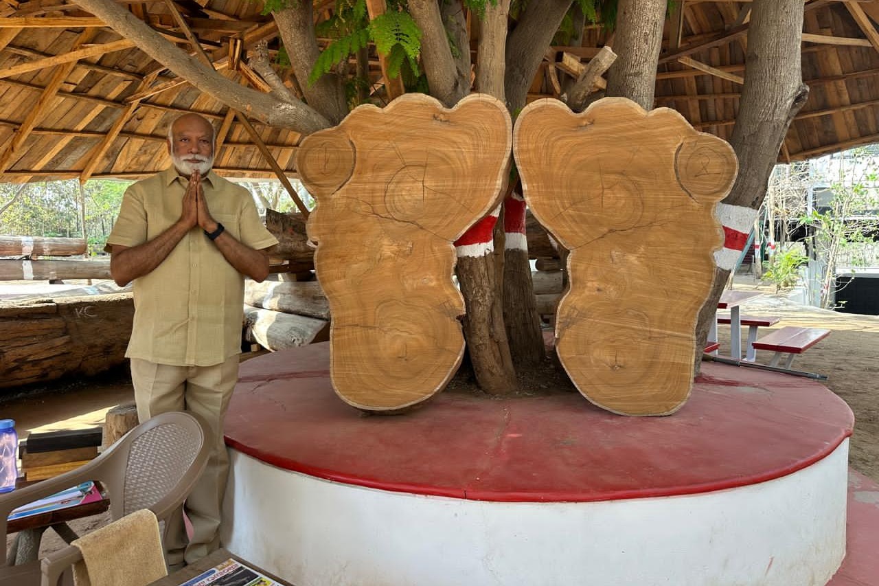 కలప దుంగలో శ్రీవారి పాదాల ఆకృతి... సినీ నిర్మాత చదలవాడ ఎస్టేట్‌లో అద్భుతం!