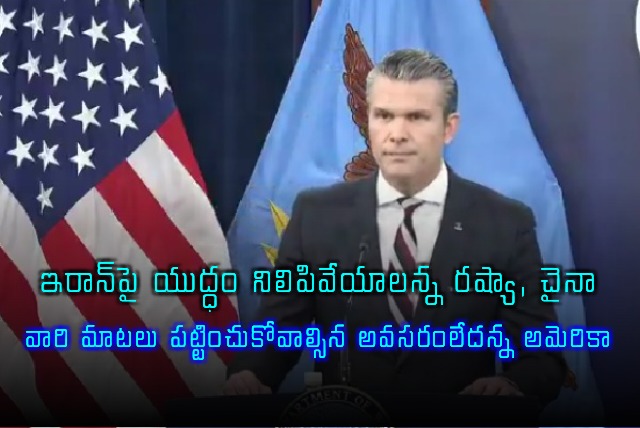 ఇరాన్‌తో కొనసాగుతున్న యుద్ధంలో కాల్పుల విరమణ పాటించాలంటూ రష్యా, చైనా చేసిన విజ్ఞప్తులను అమెరికా తోసిపుచ్చింది. ఈ ఘర్షణ పూర్తిగా టెహ్రాన్ అణు కార్యక్రమం, సైనిక సామర్థ్యాలను లక్ష్యంగా చేసుకుని సాగుతోందని, ఇందులో ఇతరుల ప్రమేయం అవసరం లేదని స్పష్టం చేసింది. బుధవారం నాడు పెంటగాన్‌లో జరిగిన మీడియా సమావేశంలో అమెరికా యుద్ధ కార్యదర్శి పీట్ హెగ్సెత్ మాట్లాడారు. ఈ విషయంలో బీజింగ్ లేదా మాస్కోతో తాము చర్చించడం లేదని, ప్రస్తుత ఘర్షణలో వారి ప్రమేయం ఏమాత్రం లేదని ఆయన తేల్చిచెప్పారు. "వారికి నేనిచ్చే సందేశం ఏమీ లేదు.. ఈ విషయంలో వారి మాటలు పట్టించుకోవాల్సిన అవసరమే లేదు" అని హెగ్సెత్ వ్యాఖ్యానించారు.
