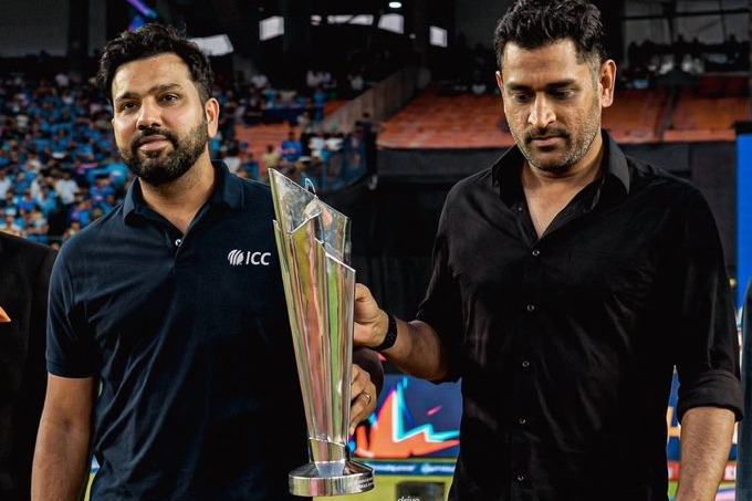 MS Dhoni Rohit Sharma bring T20 World Cup trophy
