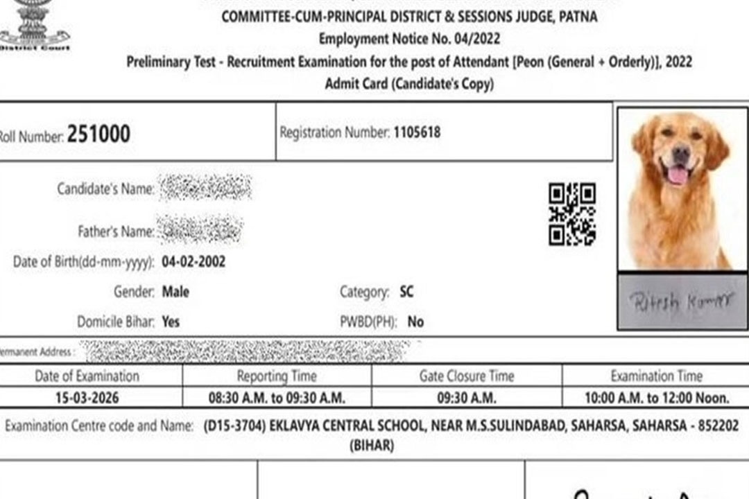 రోహ్తాస్ జిల్లా బిక్రమ్గంజ్లోని ధావా గ్రామానికి చెందిన ఓ యువకుడు 2022లో జిల్లా కోర్టులో ప్యూన్ ఉద్యోగానికి దరఖాస్తు చేసుకున్నాడు. దాదాపు నాలుగేళ్ల నిరీక్షణ తర్వాత మార్చి 15న పరీక్ష నిర్వహించనున్నట్లు బోర్డు ప్రకటించి, అడ్మిట్ కార్డులను జారీ చేసింది. అయితే, తన అడ్మిట్ కార్డును డౌన్లోడ్ చేసుకున్న అభ్యర్థి ఒక్కసారిగా షాక్కు గురయ్యాడు. కార్డుపై తన పేరు, రోల్ నంబర్ వంటి వివరాలన్నీ సరిగ్గానే ఉన్నప్పటికీ, ఫోటో మాత్రం కుక్కది ఉండటంతో విస్తుపోయాడు.