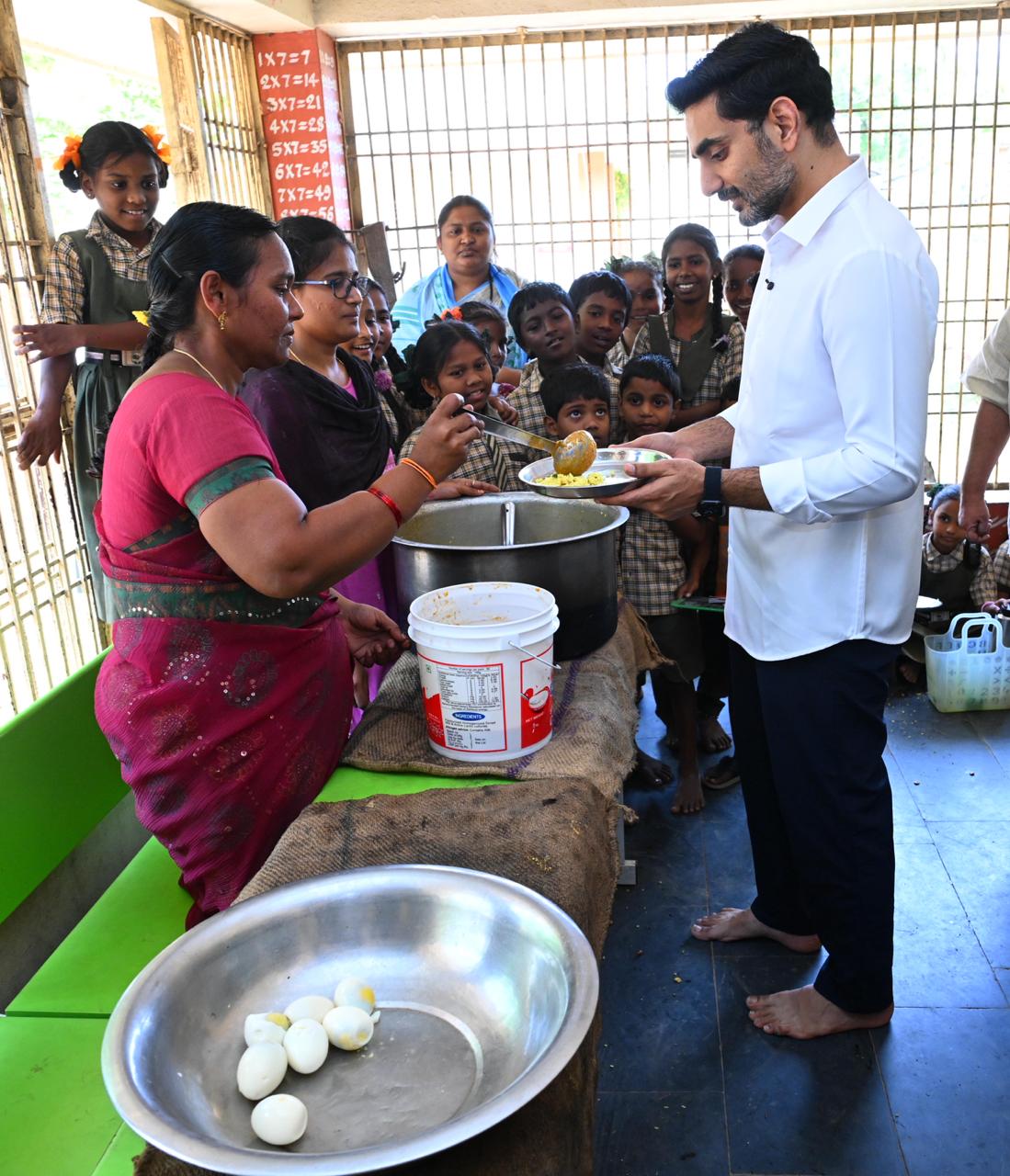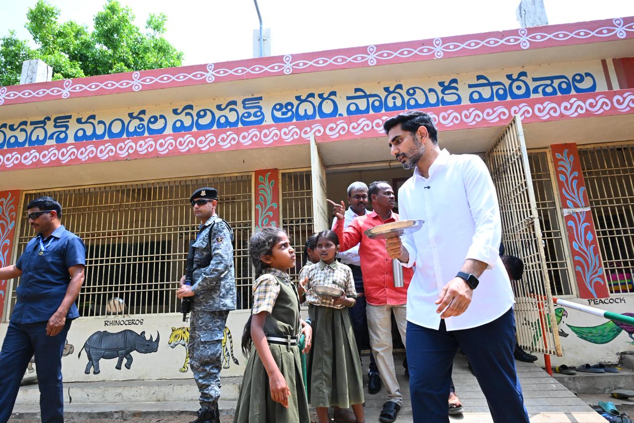 మంగళవారం నాడు మైలవరంలోని తారకరామా నగర్ మండల పరిషత్ పాఠశాలకు లోకేశ్ ఎలాంటి ముందస్తు సమాచారం లేకుండా వెళ్లారు. "భోజనం ఎలా ఉంది? రోజూ ఇలాగే ఉంటుందా లేక ఈ ఒక్కరోజే బాగుందా?" అని విద్యార్థులను ఆప్యాయంగా పలకరిస్తూ అడిగారు. భోజనం బాగుందని విద్యార్థులు చెప్పడంతో, వారితోపాటే కూర్చుని మంత్రి భోజనం చేశారు.