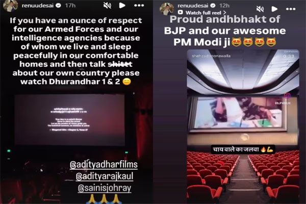 ఆదిత్య ధర్ దర్శకత్వంలో రణ్‌వీర్ సింగ్ నటించిన 'ధురంధర్: ది రివెంజ్' చిత్రాన్ని వీక్షించిన అనంతరం రేణు దేశాయ్ తన అభిప్రాయాలను ఇన్‌స్టాగ్రామ్‌లో పంచుకున్నారు. ఈ క్రమంలో ఆ సినిమాలోని ఓ సన్నివేశాన్ని ఆమె ప్రత్యేకంగా హైలైట్ చేశారు. ఆ వీడియో క్లిప్‌లో అస్వస్థతతో ఉన్న దావూద్ ఇబ్రహీంను పోలిన ఓ విలన్ పాత్ర, "ఎప్పటి నుంచైతే ఈ చాయ్‌వాలా హిందుస్థాన్‌లో అధికారంలోకి వచ్చాడో, అప్పటి నుంచి మన వాళ్లలో భయం ఇంకా పెరిగిపోయింది" అని అంటుంది. "చాయ్‌వాలా కా జల్వా" అనే క్యాప్షన్‌తో ఉన్న ఈ వీడియోను రీషేర్ చేసిన రేణూ, "బీజేపీకి, మన అద్భుతమైన ప్రధాని మోదీజీకి నేను గర్వపడే అంధభక్తురాలిని" అని రాసుకొచ్చారు.