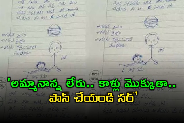 ఇటీవల తెలంగాణలో ఇంటర్ పరీక్షలు ముగియడంతో ప్రస్తుతం జవాబు పత్రాల మూల్యాంకనం జరుగుతోంది. ఈ క్రమంలో ఓ విద్యార్థి రాసిన సమాధాన పత్రం చూసి ఎగ్జామినర్ ఆశ్చర్యపోయారు. ఆ విద్యార్థి 'సార్.. మీ కాళ్లు మొక్కుతా.. నన్ను పాస్ చేయండి' అని వేడుకున్నాడు. అంతటితో ఆగకుండా, ఓ గురువు కాళ్లపై శిష్యుడు పడి నమస్కరిస్తున్నట్టుగా బొమ్మ గీశాడు. ఆ గురువు కింద 'సార్' అని, శిష్యుడి కింద 'నేను' అని రాసి తన సృజనాత్మకతను ప్రదర్శించాడు.