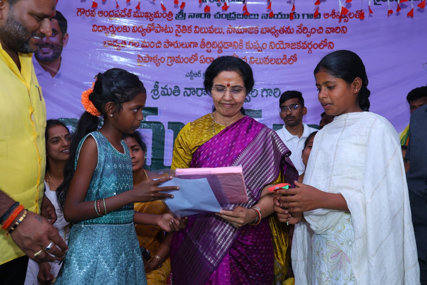విద్యార్థులకు చిన్నతనం నుంచే నైతిక విలువలు, క్రమశిక్షణ నేర్పించడం ఎంతో కీలకమని సీఎం చంద్రబాబు అర్ధాంగి, హెరిటేజ్ ఫుడ్స్ అధినేత నారా భువనేశ్వరి అన్నారు. చిత్తూరు జిల్లా కుప్పం మండలం పైపాల్యం గ్రామంలో మంగళవారం జరిగిన 'విలువల బడి' కార్యక్రమంలో ఆమె ముఖ్య అతిథిగా పాల్గొన్నారు. ఈ సందర్భంగా విద్యార్థులతో ముచ్చటిస్తూ, తన తండ్రి ఎన్టీఆర్, భర్త చంద్రబాబుల బాల్యంలోని కష్టాలను గుర్తుచేసుకుంటూ స్ఫూర్తిదాయక ప్రసంగం చేశారు. ఉన్నత స్థానాలకు చేరడానికి వారు పడిన శ్రమను విద్యార్థులకు వివరించారు.