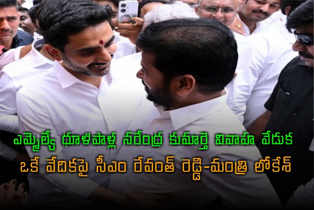 టీడీపీ సీనియర్ నేత, పొన్నూరు ఎమ్మెల్యే ధూళిపాళ్ల నరేంద్ర కుమార్ కుమార్తె వివాహ వేడుక గుంటూరులో ఘనంగా జరిగింది. ఈ కార్యక్రమానికి ఏపీ ఐటీ, విద్యాశాఖ మంత్రి నారా లోకేశ్, తెలంగాణ ముఖ్యమంత్రి రేవంత్ రెడ్డి హాజరయ్యారు. శ్రీ కన్వెన్షన్లో జరిగిన ఈ వేడుకలో ఇరు రాష్ట్రాల నేతలు పక్కపక్కనే కూర్చోవడం ప్రత్యేక ఆకర్షణగా నిలిచింది.