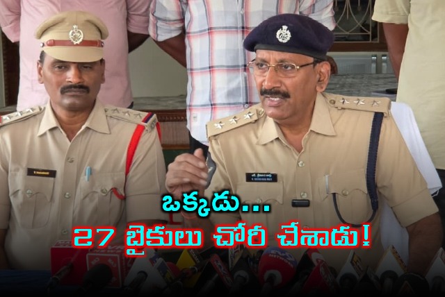 ఒకటి కాదు రెండు కాదు... ఏకంగా 27 బైకులను ఒక్కడే చోరీ చేశాడు. చెడు వ్యసనాలకు బానిసై, సులభంగా డబ్బు సంపాదించేందుకు దొంగగా మారిన ఓ వ్యక్తిని ప్రకాశం జిల్లా పోలీసులు అరెస్ట్ చేశారు. నిందితుడి నుంచి సుమారు రూ.10 లక్షల విలువైన 27 మోటార్‌సైకిళ్లను, కిలోకు పైగా గంజాయిని స్వాధీనం చేసుకున్నారు.
