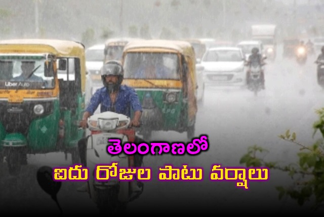 తెలంగాణ రాష్ట్రంలో ఐదు రోజుల పాటు వర్షాలు కురుస్తాయని హైదరాబాద్ వాతావరణ కేంద్రం తెలిపింది. ఈరోజు, రేపు రాష్ట్రంలోని పలు ప్రాంతాల్లో ఉరుములు, మెరుపులతో కూడిన వడగళ్ల వాన కురిసే అవకాశం ఉందని తెలిపింది. గంటకు 50 నుంచి 60 కిలోమీటర్ల వేగంతో ఈదురు గాలులు వీచే అవకాశం ఉందని వాతావరణ శాఖ తెలిపింది.