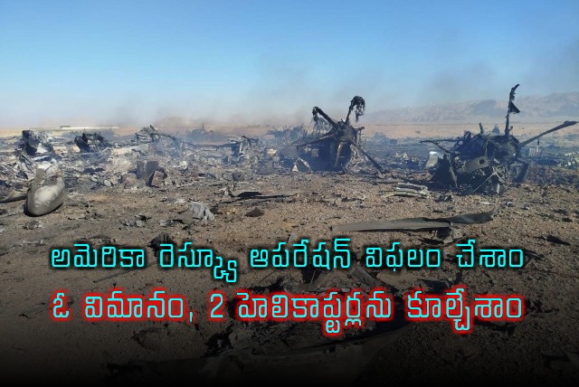 తమ భూభాగంలో అమెరికా చేపట్టిన ఓ రెస్క్యూ ఆపరేషన్‌ను విఫలం చేశామని ఇరాన్ ప్రకటించింది. ఈ ఆపరేషన్ సందర్భంగా ఒక సీ-130 రవాణా విమానంతో పాటు రెండు బ్లాక్ హాక్ హెలికాప్టర్లను కూల్చివేసినట్లు ఇరాన్ రివొల్యూషనరీ గార్డ్స్ (ఐఆర్జీసీ) సంచలన ప్రకటన చేసింది. అమెరికా చేపట్టిన ఈ చర్య పూర్తిగా విఫలమైందని ఇరాన్ సైనిక కమాండ్ పేర్కొంది. ఈ ఆపరేషన్‌లో ఐదుగురు మరణించినట్లు ఇరాన్ మీడియా తెలిపింది.