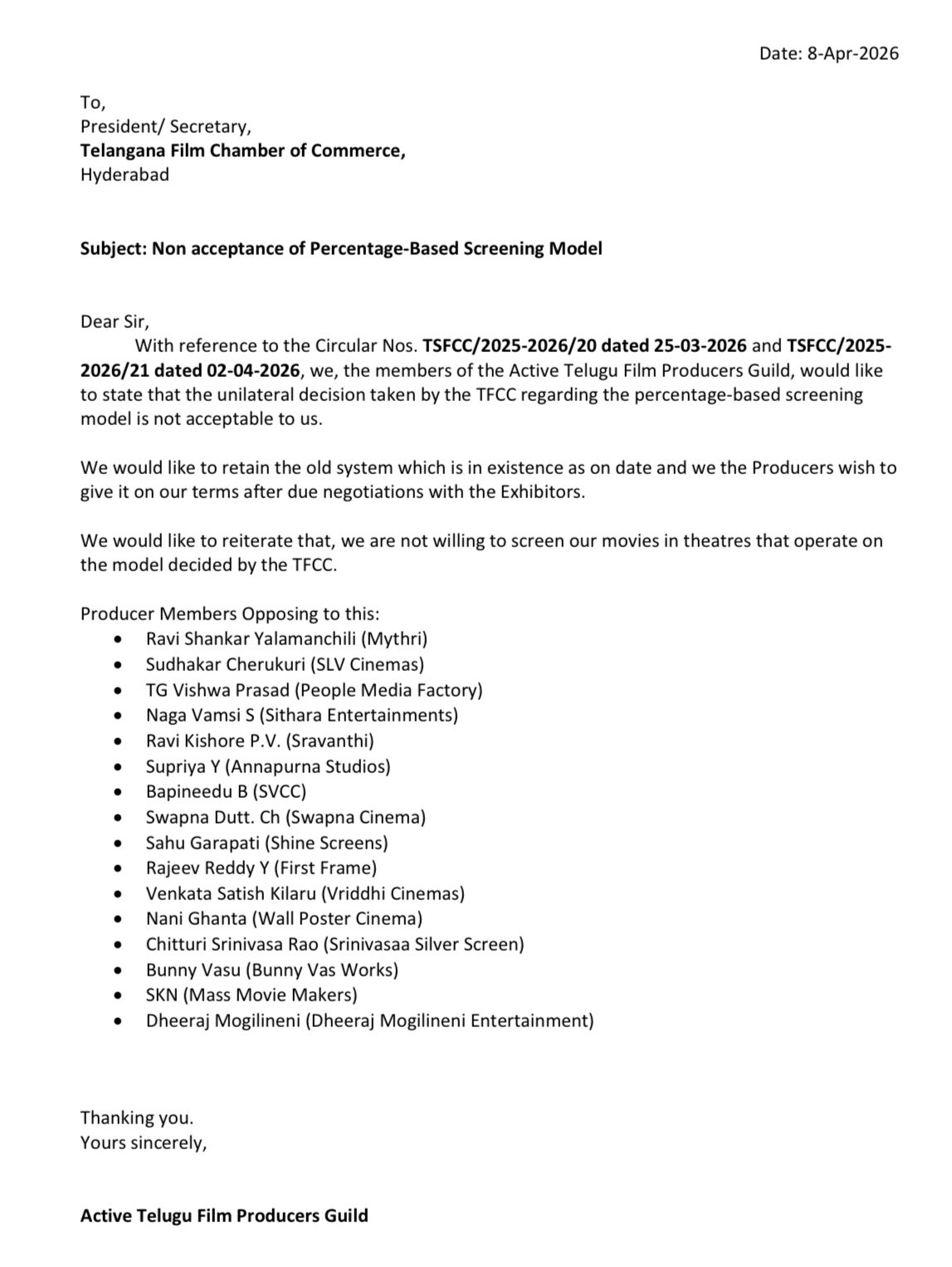 తెలుగు చిత్ర పరిశ్రమలో మరో కొత్త వివాదం రాజుకుంది. థియేటర్లలో సినిమాల ప్రదర్శనకు సంబంధించి తెలంగాణ ఫిల్మ్ ఛాంబర్ ఆఫ్ కామర్స్ (TFCC) ఇటీవల ప్రతిపాదించిన "పర్సంటేజ్ ఆధారిత స్క్రీనింగ్ మోడల్"పై అగ్ర నిర్మాతలు తీవ్ర అభ్యంతరం వ్యక్తం చేశారు. ఈ విధానాన్ని ఏకపక్షంగా తమపై రుద్దడాన్ని అంగీకరించబోమని స్పష్టం చేస్తూ, యాక్టివ్ తెలుగు ఫిల్మ్ ప్రొడ్యూసర్స్ గిల్డ్ (ATFPG) ఏప్రిల్ 8న ఛాంబర్కు ఓ అధికారిక లేఖ రాసింది.
