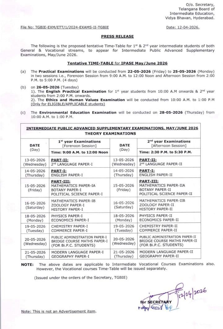 తెలంగాణ ఇంటర్మీడియట్ విద్యార్థులకు ముఖ్య గమనిక. ఇంటర్ అడ్వాన్స్డ్ సప్లిమెంటరీ పరీక్షలు, 2026 మే/జూన్ కు సంబంధించిన టైమ్టేబుల్ను తెలంగాణ ఇంటర్మీడియట్ బోర్డు (TGBIE) విడుదల చేసింది. జనరల్, ఒకేషనల్ కోర్సులకు చెందిన ఫస్టియర్, సెకండియర్ విద్యార్థుల కోసం ఈ షెడ్యూల్ను ప్రకటించింది. థియరీ పరీక్షలు మే 13వ తేదీ నుంచి ప్రారంభమై మే 21వ తేదీన ముగుస్తాయి.