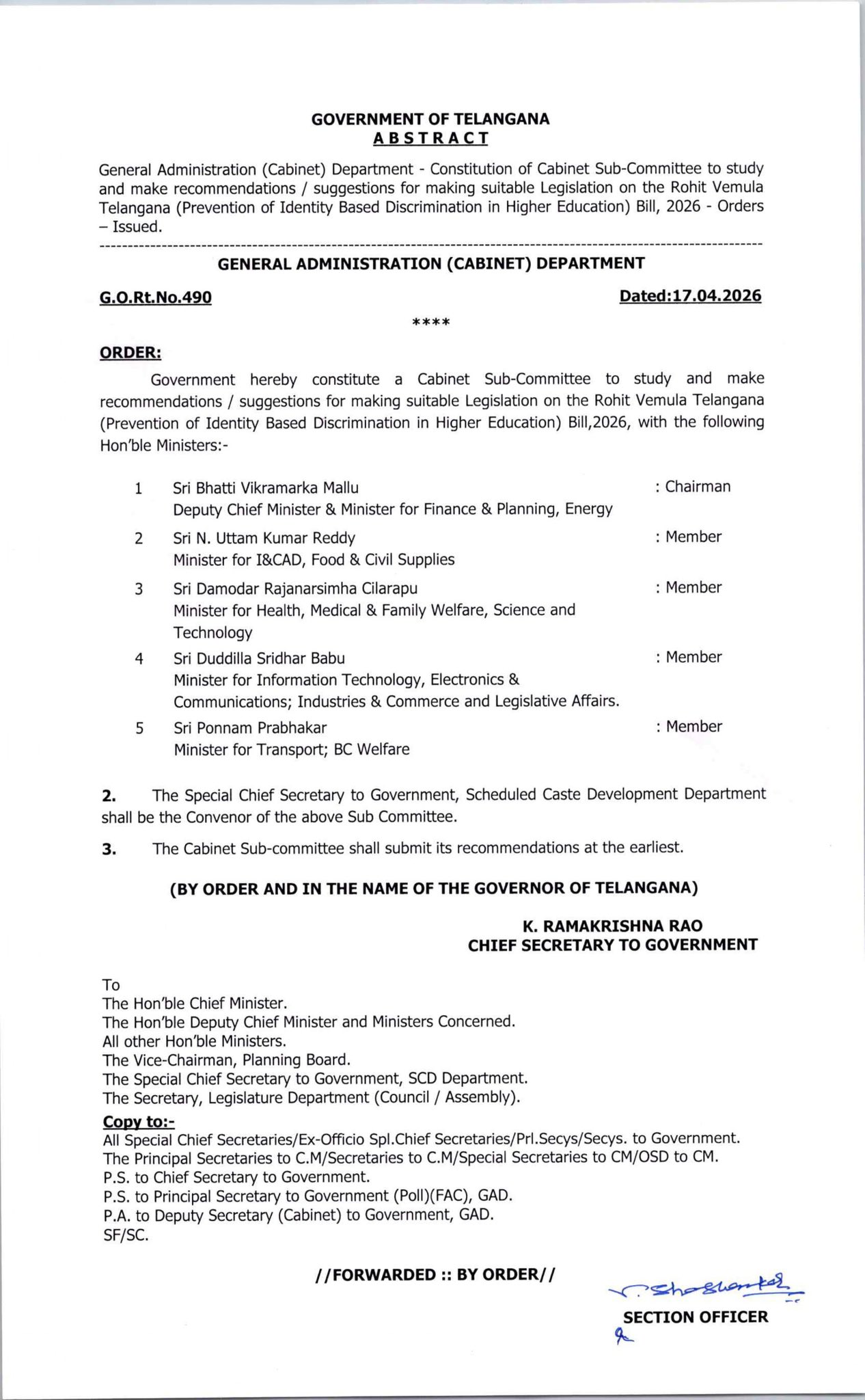రోహిత్ వేముల చట్టంపై కేబినెట్ సబ్ కమిటీ.. ఉత్తర్వులు జారీ చేసిన తెలంగాణ ప్రభుత్వం