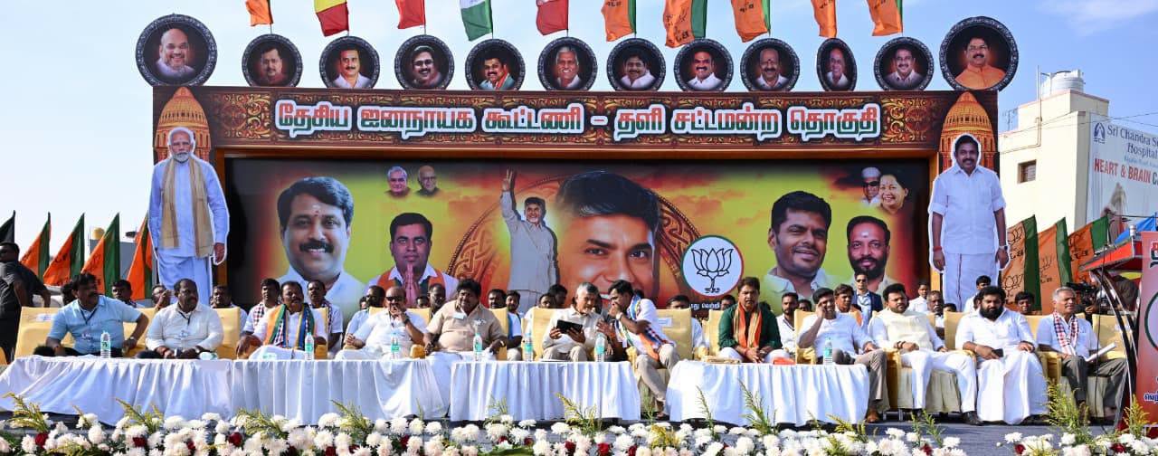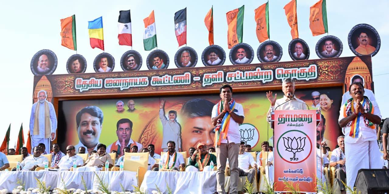 ఈ సందర్భంగా చంద్రబాబు మాట్లాడుతూ.. తమిళనాడులో మార్పు రావాలంటే ఎన్డీయే కూటమి అధికారంలోకి రావాలని పిలుపునిచ్చారు. కేంద్రంలో, రాష్ట్రంలో ఒకే కూటమి ప్రభుత్వం ఉంటే అభివృద్ధి వేగవంతం అవుతుందని తెలిపారు. ప్రస్తుతం ఆంధ్రప్రదేశ్లో జరుగుతున్న అభివృద్ధి డబుల్ ఇంజిన్ సర్కారు వల్లే సాధ్యమైందని ఆయన ఉదాహరించారు.