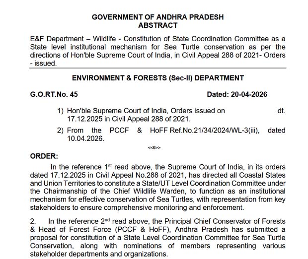 గతేడాది డిసెంబర్ 17న సుప్రీంకోర్టు ఇచ్చిన తీర్పు ప్రకారం, అన్ని తీరప్రాంత రాష్ట్రాలు, కేంద్రపాలిత ప్రాంతాలు తాబేళ్ల సంరక్షణ కోసం ప్రత్యేక యంత్రాంగాలను ఏర్పాటు చేయాలని ఆదేశించింది. ఈ నేపథ్యంలో, రాష్ట్ర అటవీ దళాల అధిపతి (పీసీసీఎఫ్) సమర్పించిన ప్రతిపాదనలను పరిశీలించిన ప్రభుత్వం, కమిటీ ఏర్పాటుకు ఆమోదం తెలుపుతూ జీవో ఆర్టీ నెం. 45ను విడుదల చేసింది.