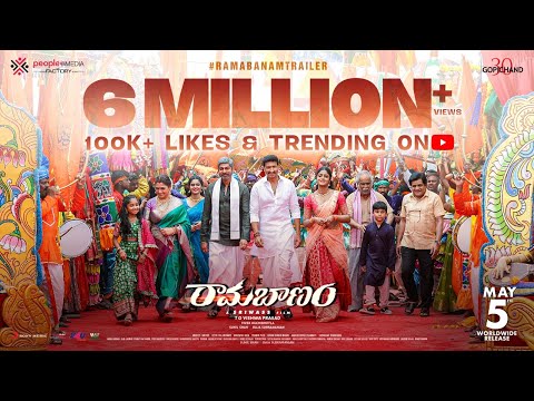 People Media Factory's production, "Rama Banam", directed by Sriwass and starring Gopichand and Dimple Hayati, is set to hit theaters on May 05, 2023. Along with the lead actors, Khushbu and Jagapathi Babu play significant roles in this family entertainer, produced by TG Vishwa Prasad under People Media Factory. After multiple promo and song launches, the makers of the film released the theatrical trailer today. The trailer highlights the romance between Gopichand and Dimple, with Dimple playing the role of a vlogger based in Kolkata. In addition to the lead actors, Getup Srinu, Ali, Satya, and Saptagiri will provide comic relief, while Jagapathi Babu will play the owner of an organic food production company. "Rama Banam" also boasts of a talented supporting cast including Tarun Raj Arora, Nasser, Shubalekha Sudhakar, Sachin Khedekar, and Kasi Vishwanath. With a promising trailer and an impressive lineup of actors, "Rama Banam" is expected to be a hit among audiences.