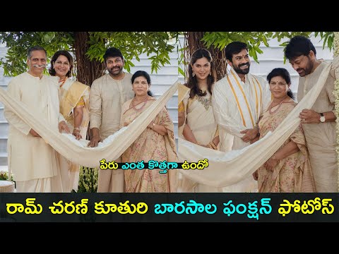 Mega Power Star Ram Charan and his wife Upasana Kamineni Konidela embraced the joyous occasion of their baby girl's naming ceremony in Hyderabad. Opting for a traditional and organic setup adorned with fragrant flowers and a beautifully crafted tree-like structure in the courtyard, the couple created a memorable ambiance to mark this significant milestone. During the ceremony, the eagerly awaited name of the Mega Princess was revealed as 'Klin Kaara Konidela,' the proud daughter of Ram Charan and Upasana. The name was unveiled by Chiranjeevi, the esteemed grandfather of the baby girl, in a heartwarming moment that added to the joy and excitement of the event. The cradle ceremony took place today at their residence in Jubilee Hills, Hyderabad. Taking to social media, Chiranjeevi shared the news and revealed that they named their granddaughter 'Klin Kaara,' a name inspired by a spiritual chant from the revered scripture "Lalitha Sahasranama." The name holds a profound meaning, signifying "purifying energy," reflecting the