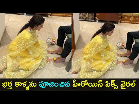 Popular actress Pranitha Subhash has recently made headlines with a heartfelt gesture she shared on social media. In a photo, the actress can be seen performing a ritual called Bheemana Amavasya. The ritual highlights a married women performing a special puja to pray for the long and prosperous life of their husbands and other male family members. In the viral picture, Pranitha is seen dressed in a yellow salwar suit and seen sitting near her husband Nitin Raju's feet. She is seen adorning his feet with flowers and gently touching them. Netizens are quick to praise the actress for keeping her stardom aside and upholding the tradition.